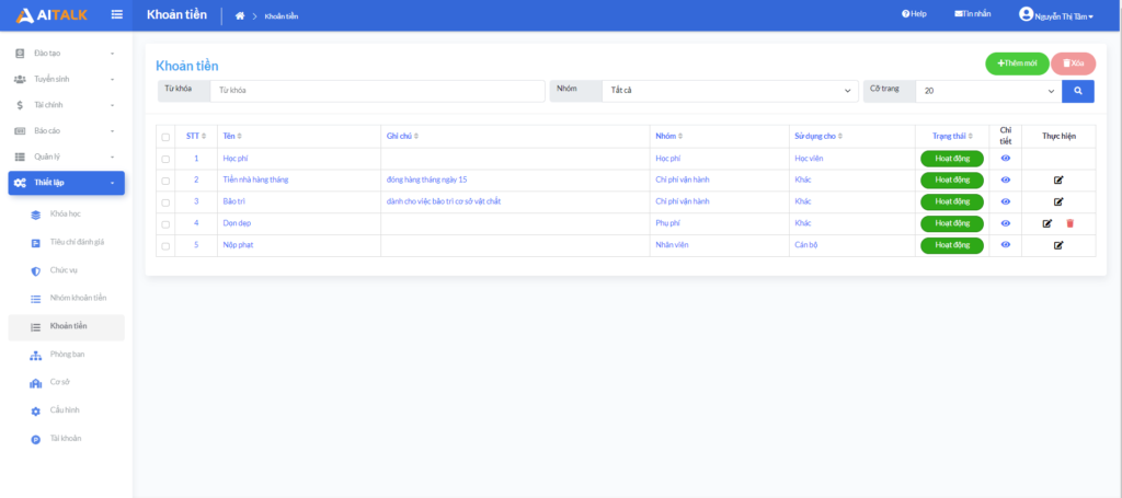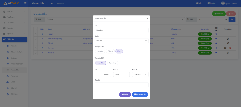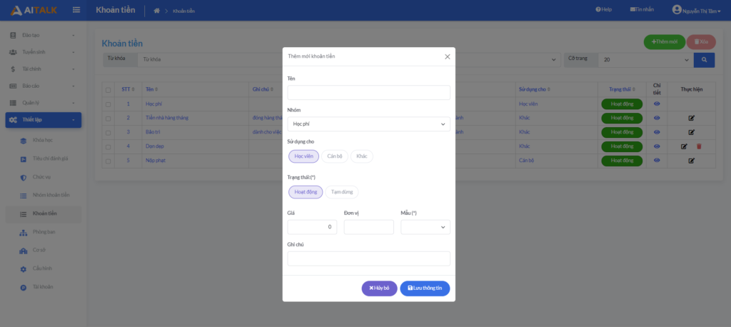 – Giao diện Thêm khoản tiền, cho phép quản trị tạo mới.