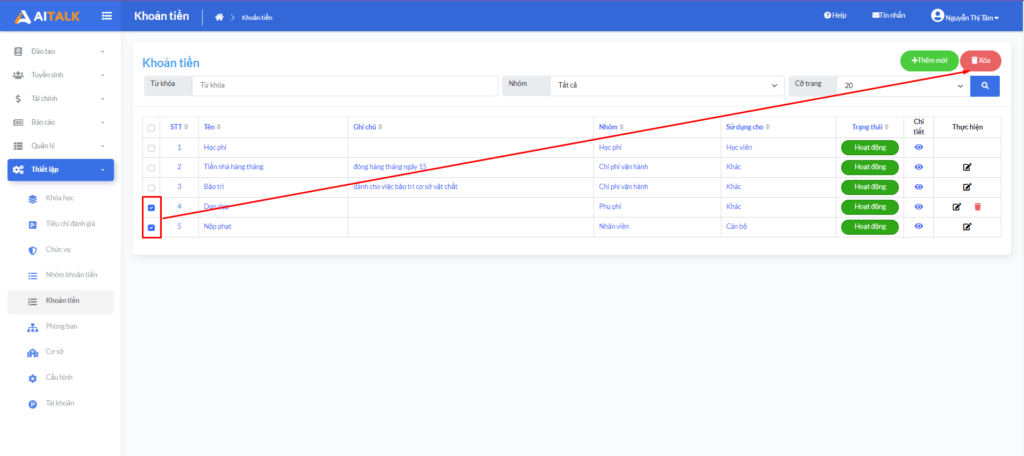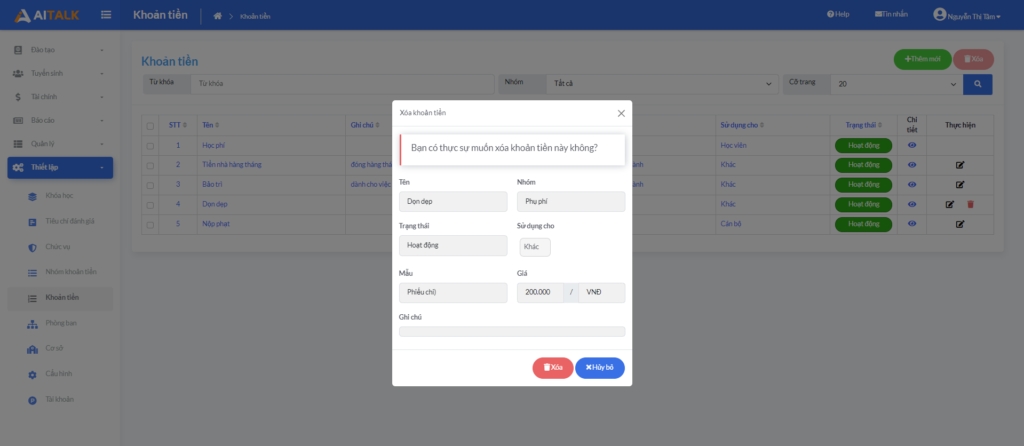 Bước 1: Từ màn hình Danh mục khoản tiền => click icon xóa của đối tượng cần xóa.