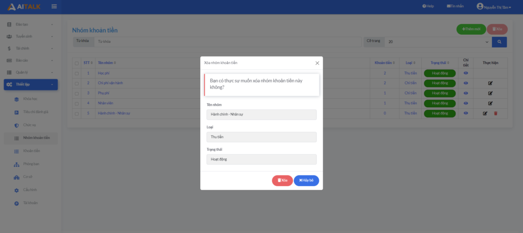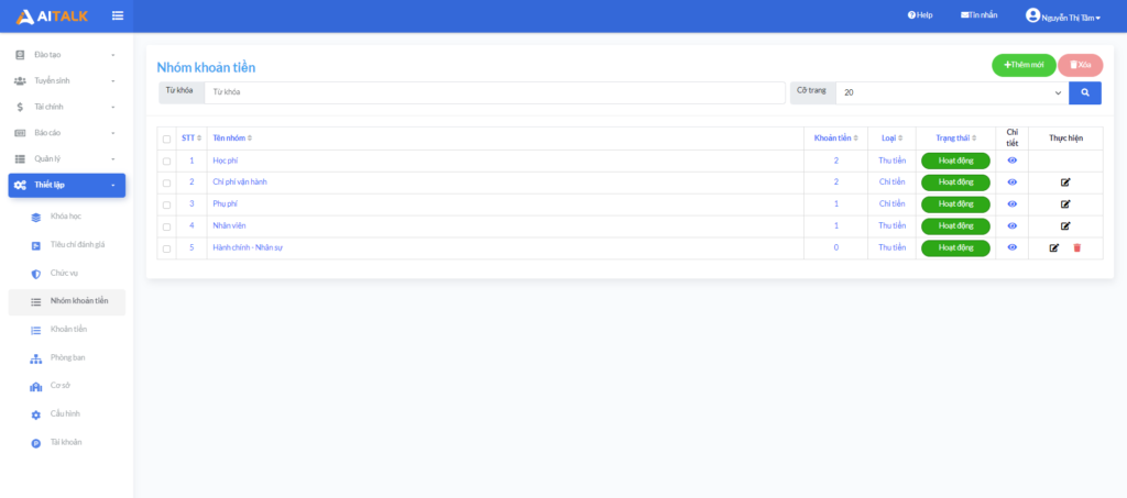 Từ giao diện Nhóm khoản tiền, quản trị click