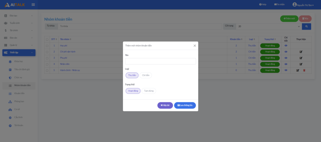 – Giao diện Thêm nhóm khoản tiền, cho phép quản trị tạo mới.