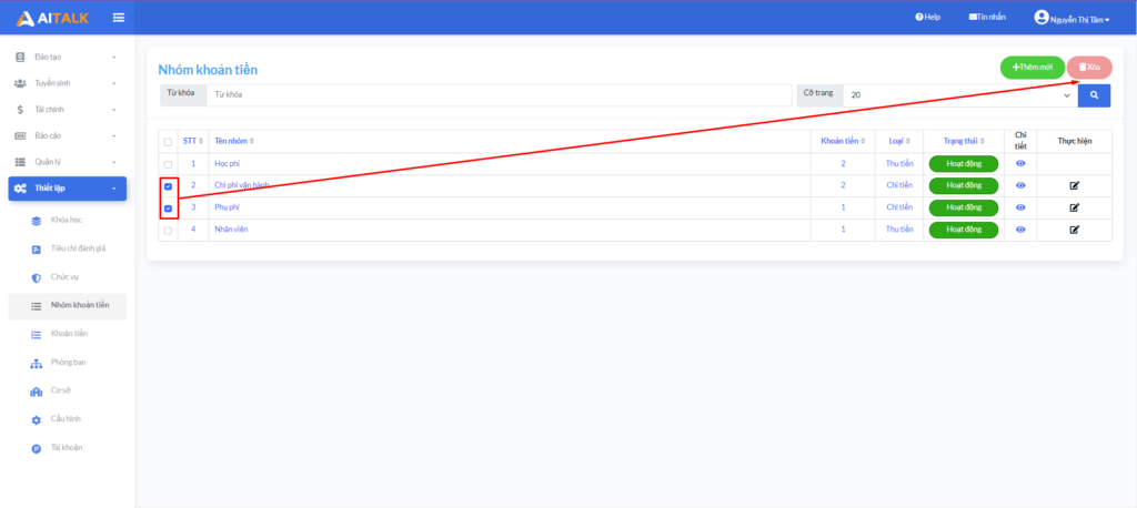 Bước 1: Từ màn hình nhóm khoản tiền => tích chọn 1 số hoặc tích all để chọn tất cả => click Xóa