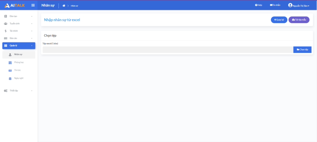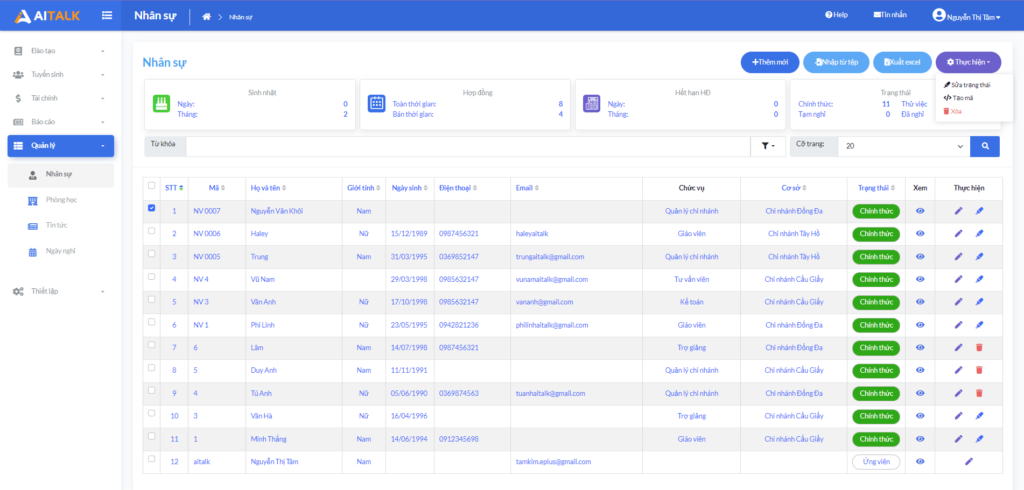Sau khi đăng nhập vào hệ thống, chọn Menu: Quản lý – Nhân sự, trang “Nhân sự” sẽ cung cấp các thông tin liên quan như trong hình minh họa sau: