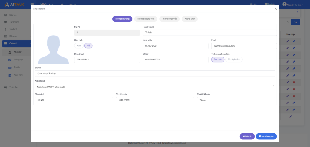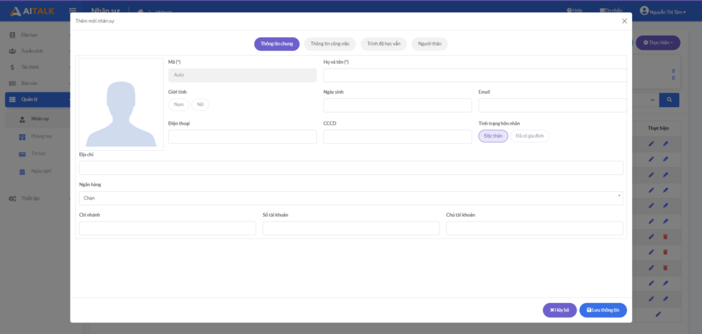 – Giao diện Thêm mới nhân sự, cho phép quản trị tạo mới.