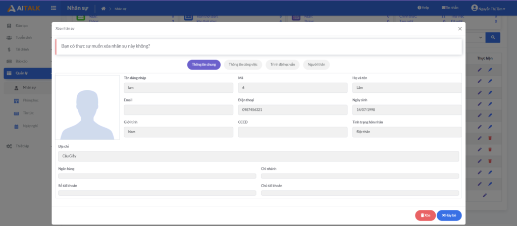 Bước 1: Từ màn hình Quản lý nhân sự => click icon xóa của đối tượng cần xóa.