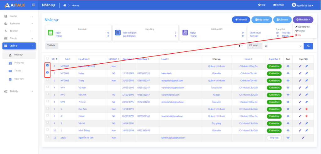 Bước 1: Từ màn hình => tích chọn 1 số nhân sự hoặc tích all để chọn tất cả => click Xóa